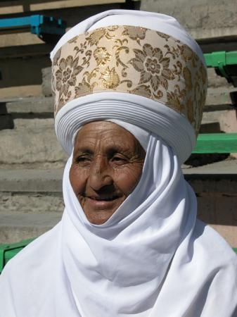 Headdress is an indispensable attribute of a married Kyrgyz woman. It sits tight on the head and completely covers the hair. The headdress is decorated with ornaments made by various types of seams with colored threads. A turban of white material called an elechek is always worn over the hat.