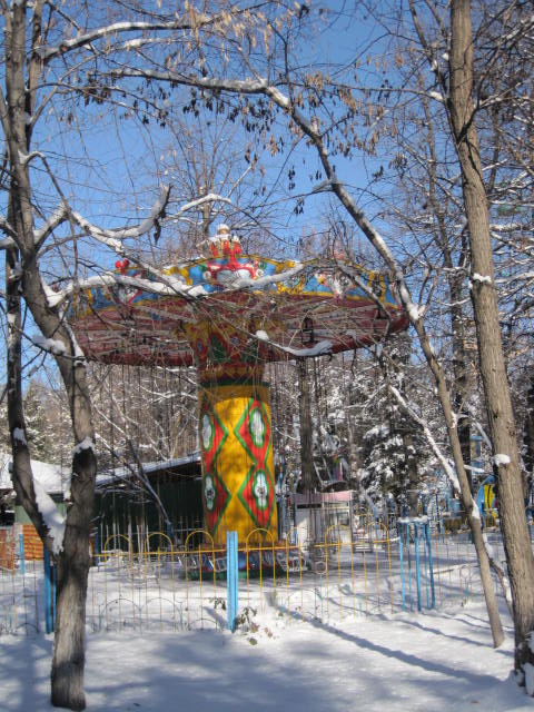 Random shots in Panfilov. Forlorn is the only word I can think of for an amusement park that sits quiet and empty. But there is also a kind of hopefulness that radiates from the bright colors. They telegraph that despite snow and winter and stillness, warmer days will come once more and so will people to fill the rides. They will return to be amused.