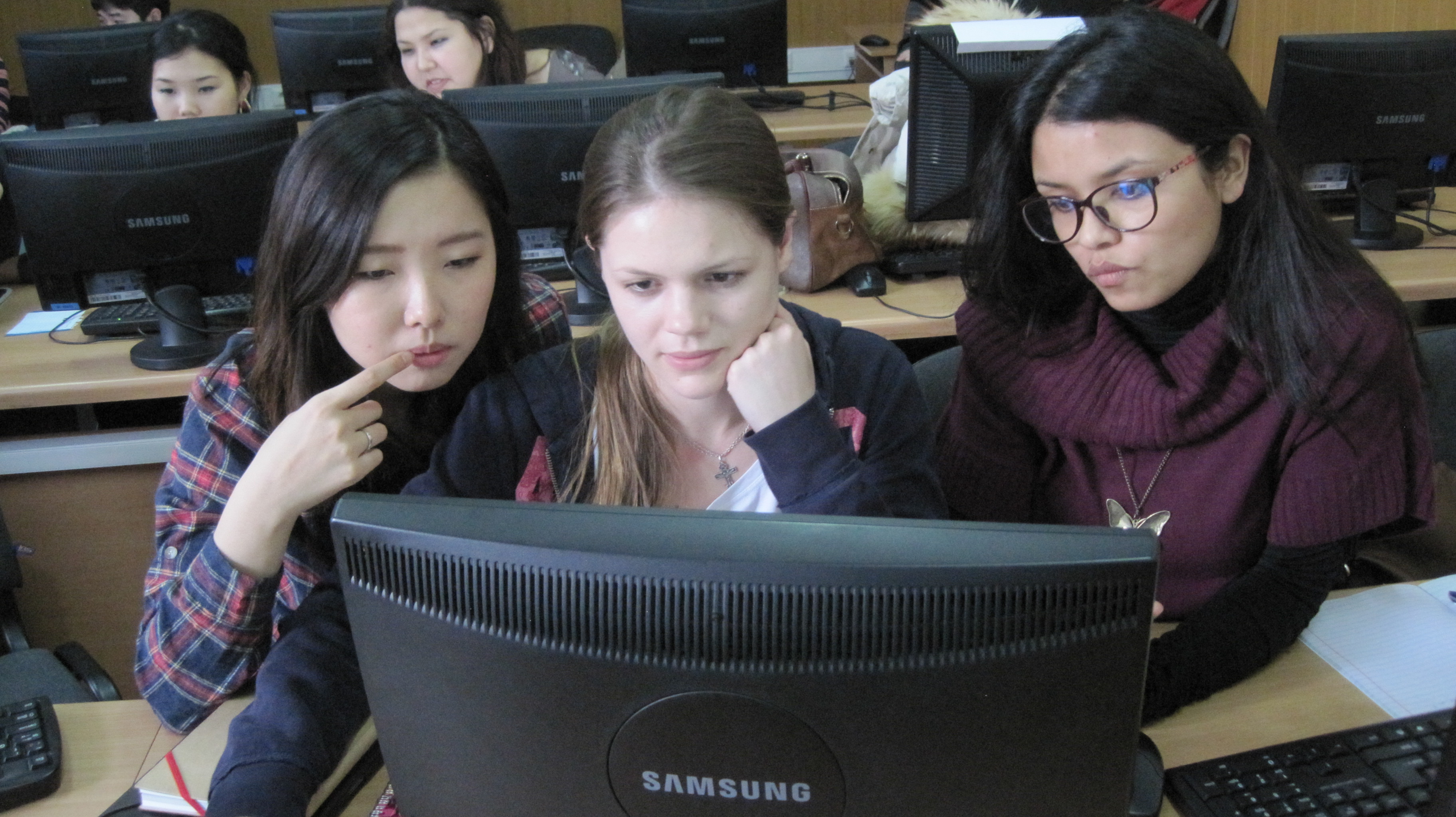 Working with professional journalists in Myanmar/Burma.Discussing media ethics and best practices with Burmese journalists. Nyi Nyi stands beside me to translate.Student journalists working on as assignment in Bishkek, Kyrgyzstan, at the American University of Central Asia.